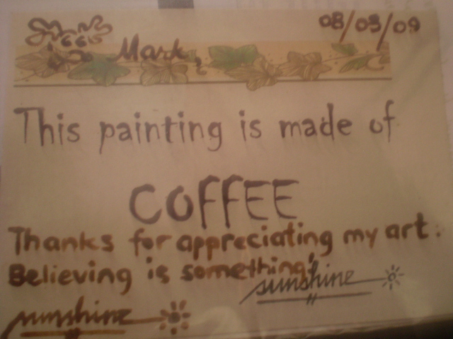 Sunshine Plata, a 28-year-old Filipina painter, still recalls how she came to know using coffee as an art medium back in 2000. A sophomore Psychology student at University of Santo Tomas at that time, she said she felt the need to look for an affordable alternative to oil for her paintings.