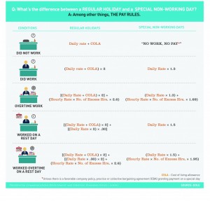 Meanwhile, those who work during national holidays will get 200% of their regular rate for every hour of service rendered. In common parlance, this is referred to as “double pay.”